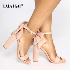 LALA IKAI Women Flock Buckle Strap Party Wedding Sandals Ladies Square Heels Butterfly-knot Decoration Summer Shoes 014C1889-5